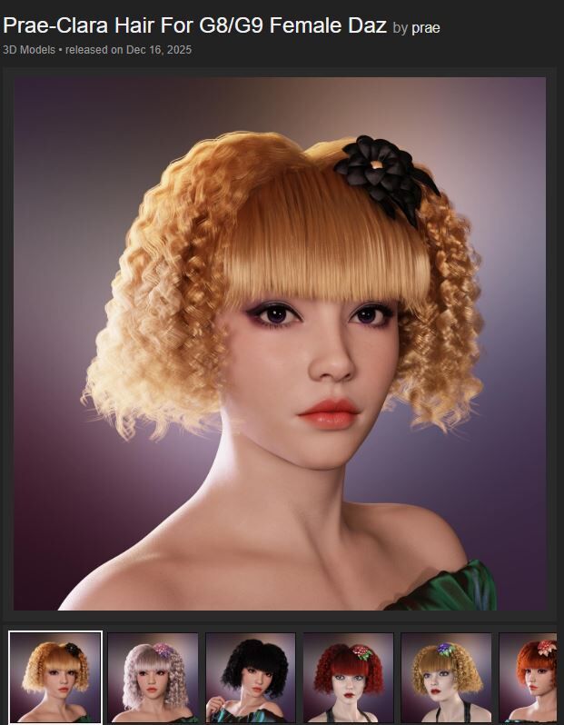 Renderosityでは、praeさんのPrae-Clara Hair For G8/G9 Female Daz を買いました。とても綺麗で愛らしい髪形で、凄く気に入っています。