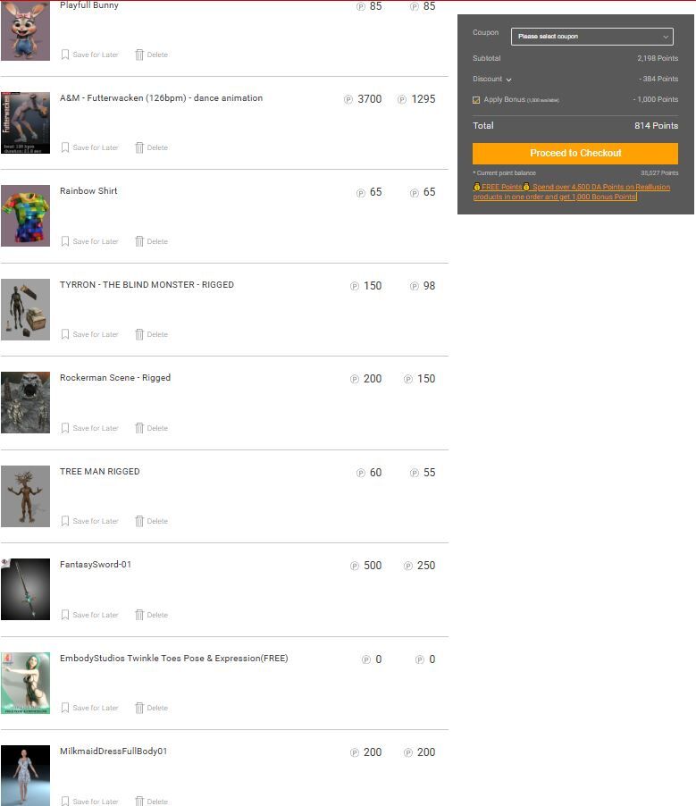 Reallusionで毎月1000 DAを無料で獲得できるキャンペーンは、ReallusionのMarketplaceで 3 人の異なる著者が作った、それぞれ1個のコンテンツ(合計3個になる)を買うと、1,000 ボーナス ポイントが無料でいただけるサービスです。月川は毎月コンテンツを買って、毎月1,000 ボーナス ポイントをいただいています。このキャンペーンの期間は、今年の12月まで続きます。