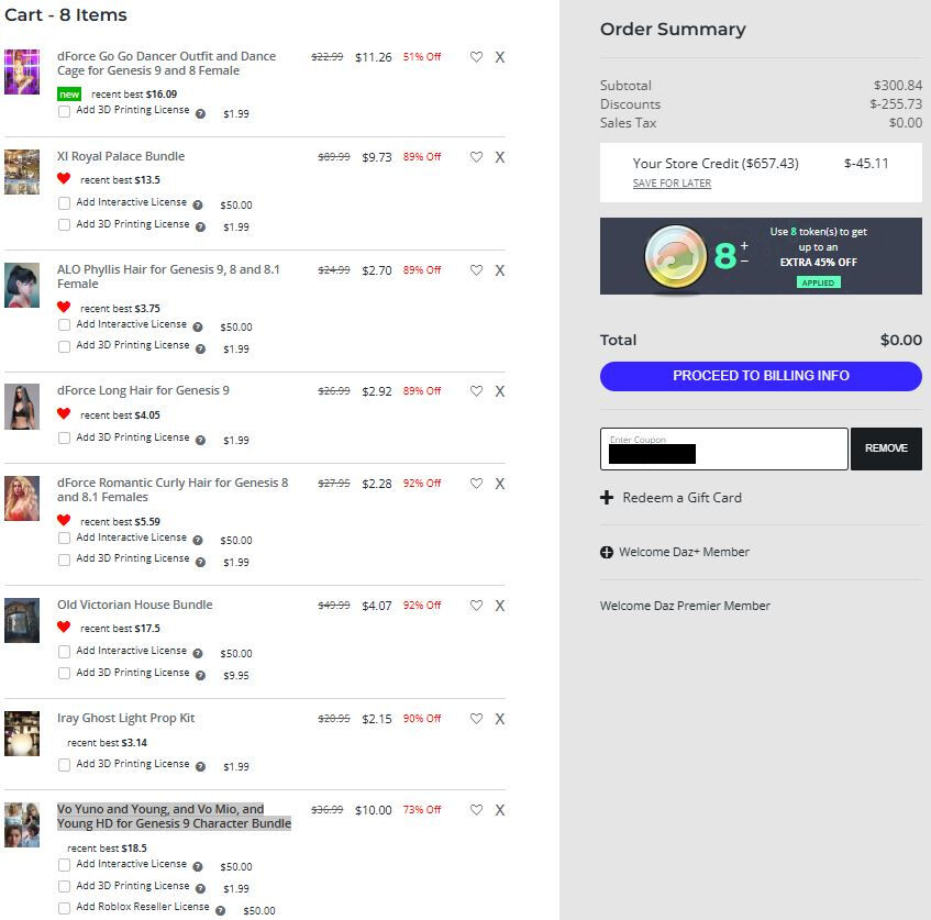 Tokenが貯まっていたので、XI Royal Palace BundleやdForce Romantic Curly Hair for Genesis 8 and 8.1 Females 等の欲しかったコンテンツを安く買いました。